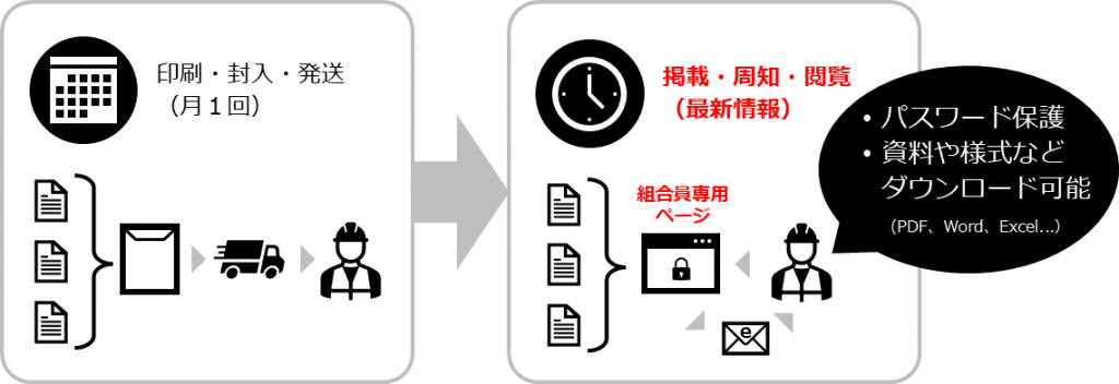 組合員専用ページに情報を掲載してメールで周知することで、組合員(組合加盟の電気工事店)はホームページを開いて最新情報を閲覧することができる。組合員専用ページはパスワードで保護されており、一般公開されていない。リニューアル前は資料を封筒に入れて毎月、組合員に発送していた。