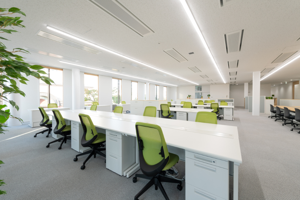 オフィスチェアにコーポレートカラーのグリーンを使用し、企業イメージを表現したカラーコーディネートにまとめました。