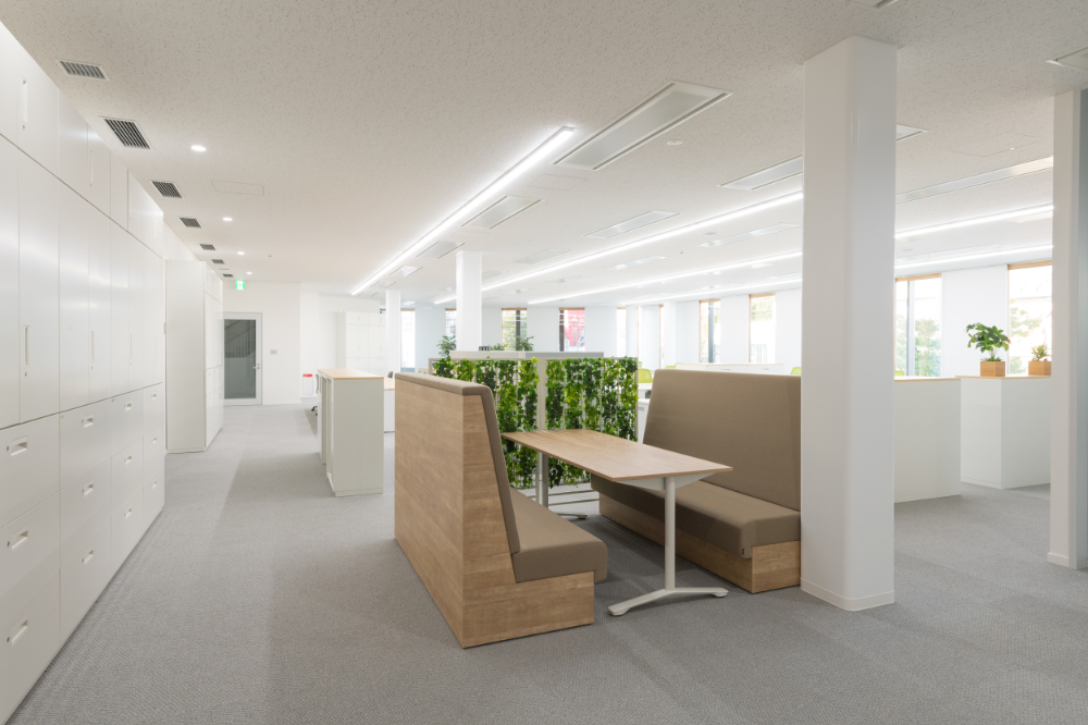 また、更衣室や休憩室へ向かう廊下の突き当りには、フェイクグリーンのパネルを設置しており、出社や退社時に心理的に緊張感を和らげる効果が期待できます。