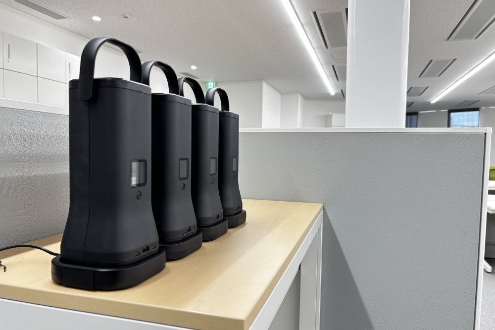 執務室内に設置したモバイルバッテリーはUSB-AおよびUSB-C対応で、最大6台の端末を同時に充電できる仕様です。電源のない席でのPC作業や、非常時の電源確保の役割を担います。