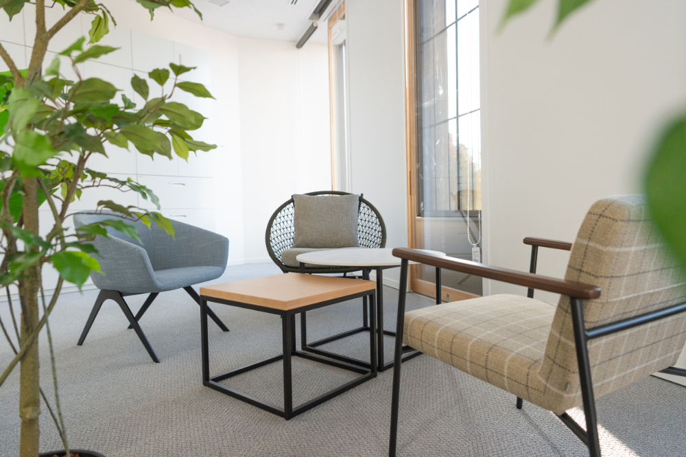 執務室の一角にはデザインの異なる3脚のソファを配置しました。それぞれ座り心地や視線が異なる遊び心のある空間で、執務から離れてリフレッシュできるようデザインしました。