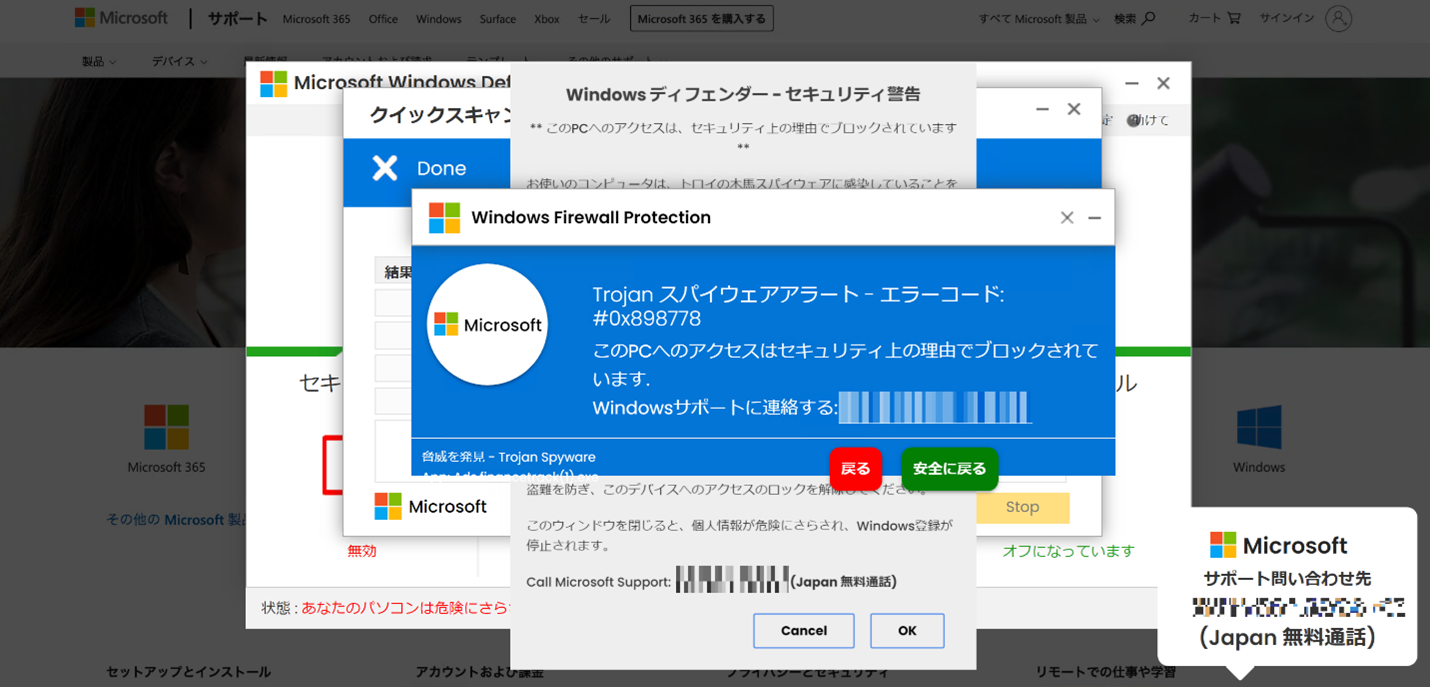 ここ数日、サポート詐欺に関するご相談が相次いでいます。「トロイの木馬に感染されました」とか「Windowsセキュリティ警告」といったような文言が表示され、耳障りな警告音とともにパソコンの操作ができなくなり、表示されている電話番号まで電話をするように促される”詐欺ページ”に関するお問い合わせです。