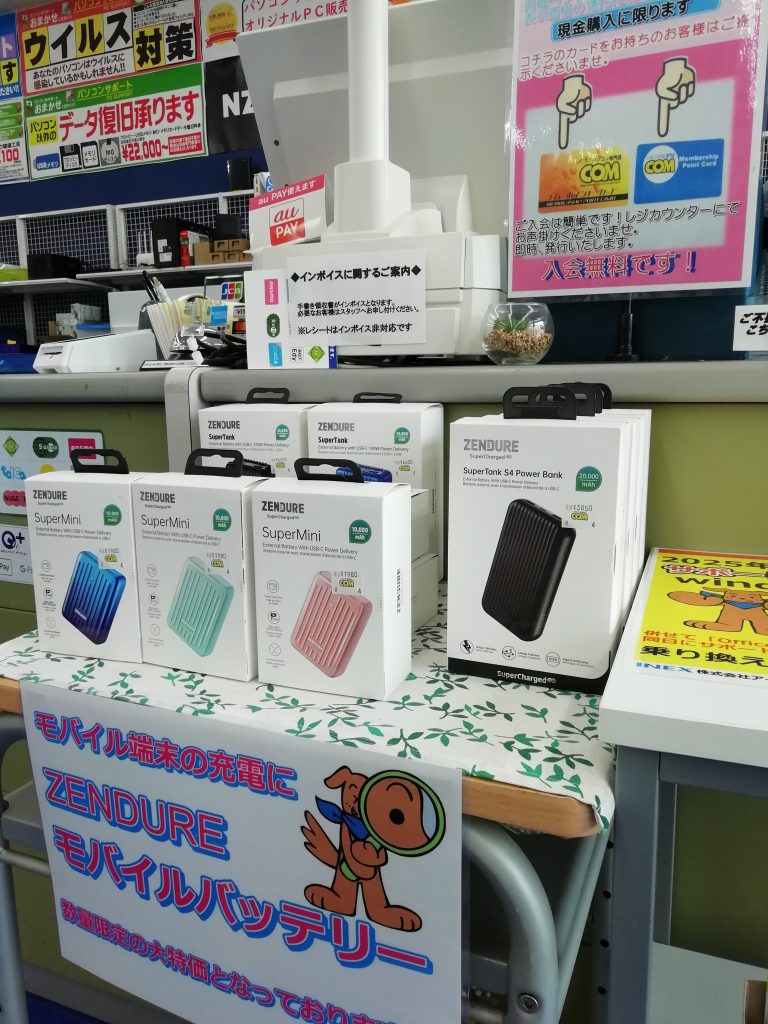 当店レジ前にて「ZENDUREモバイルバッテリー」を特価で販売中です。