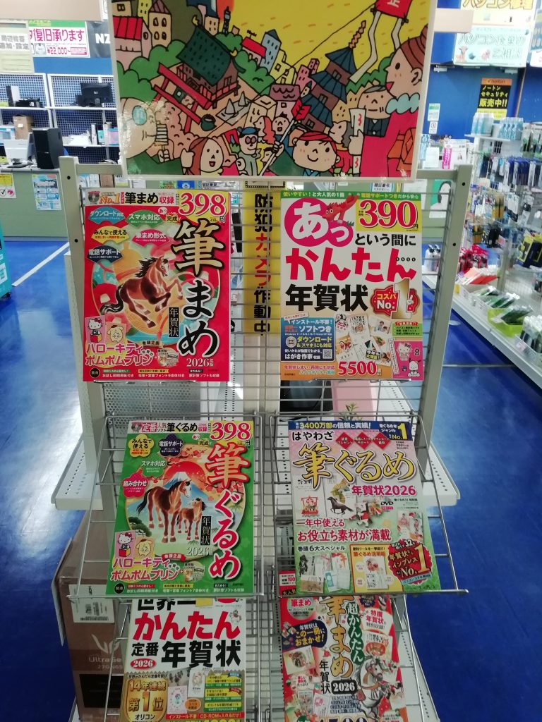 COM☆TOPICS 年賀状作成に便利! スタッフ情報 2025.11.13 2026年の年賀状の販売が開始されております。当店では今年も「年賀状作成マニュアル本」を販売しております。お好みの素材を使って「年賀状」や「寒中お見舞い」が簡単に作成出来ます。お手軽な価格帯となっておりますので是非一冊いかがでしょうか。