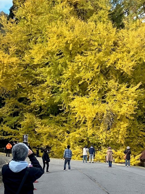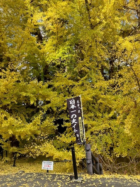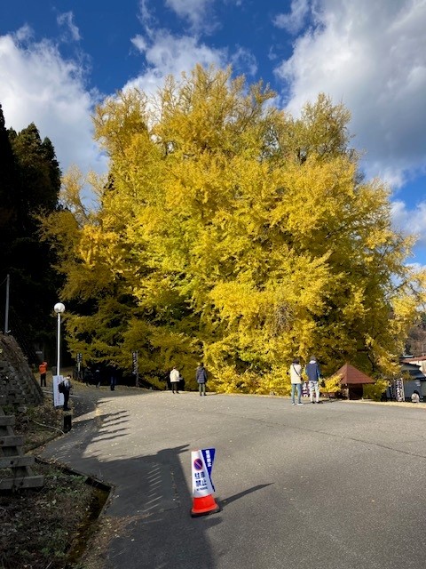 今年最後の3連休は皆様はどうお過ごしでしたでしょうか。先週の金曜日の夜、天気予報を見ると土曜日は雨が降らない予想。日曜日、月曜日は雨マーク。出かけるならば土曜日と思い、熊の出没を気にしながら、以前行ったことがある深浦町北金ヶ沢の大銀杏の紅葉はもう終わったのかと調べてみるとちょうど見頃とのこと。そんなことで土曜日に片道3時間半かけて深浦まで行ってきました。前回は新緑の時期でまだ葉も小さく幹自体は古いものの重厚感があり、その迫力には圧倒された感じでしたが、今回はよりスケールアップし雄大な黄色い壁のようでした。見頃という事もあり、また好天にも恵まれたこともあると思いますが青森、秋田、盛岡と県外ナンバーの車も多く沢山の人で賑わっていました。実際に見る価値があると思った通称「ビックイエロー」皆さんもご覧になれば絶対に感動しますよ。今年はこれから散っていくと思いますから来年是非行ってみてください。そして樹齢1,000年以上の国天然記念物に指定されているとのことですので今後もずっと守り続けて欲しいと思います。