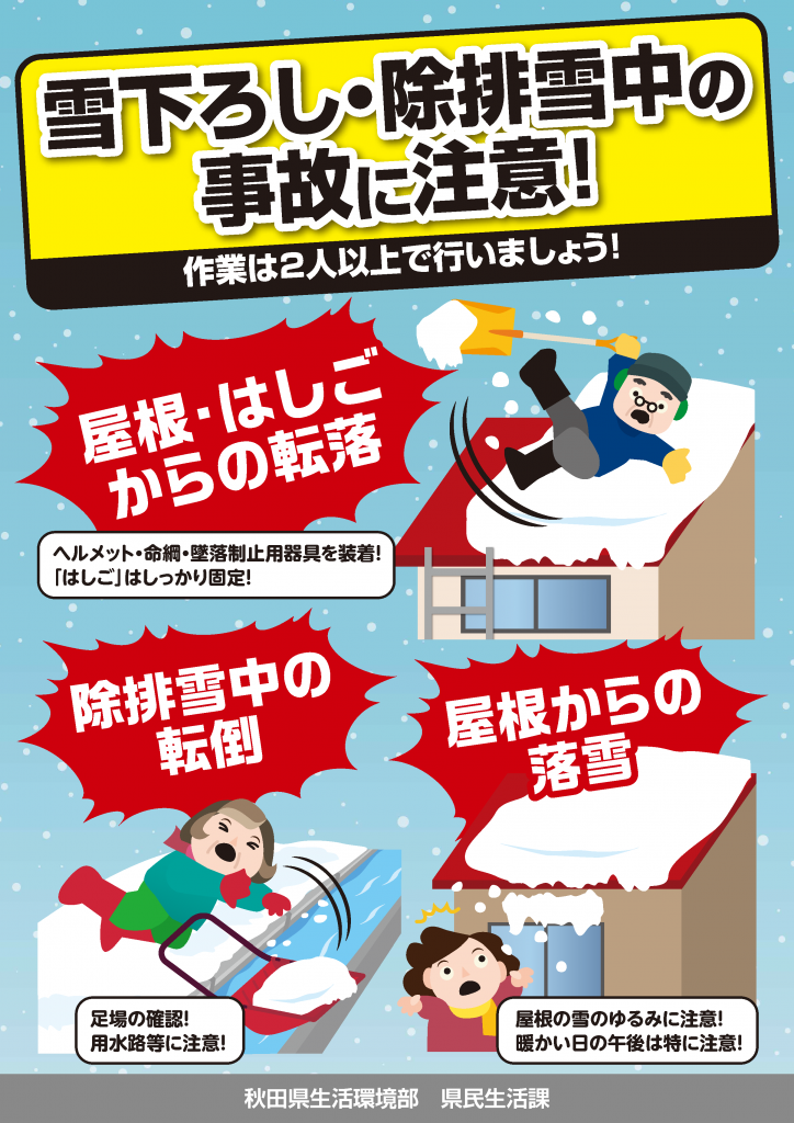 除排雪作業は最新の注意を払い、必ず複数の人で行うようにして下さい。
