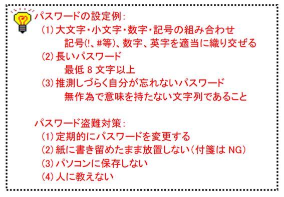 設定するパスワードには生年月日や簡単な数字の組み合わせなど、簡単に推測されやすいものは使用ないほうがいいと思います。