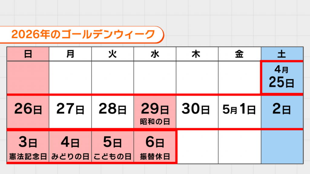 2026年の大型連休は最長8連休が可能です、平日部分を全て休めば12連休も可能な祝日配置となっています。