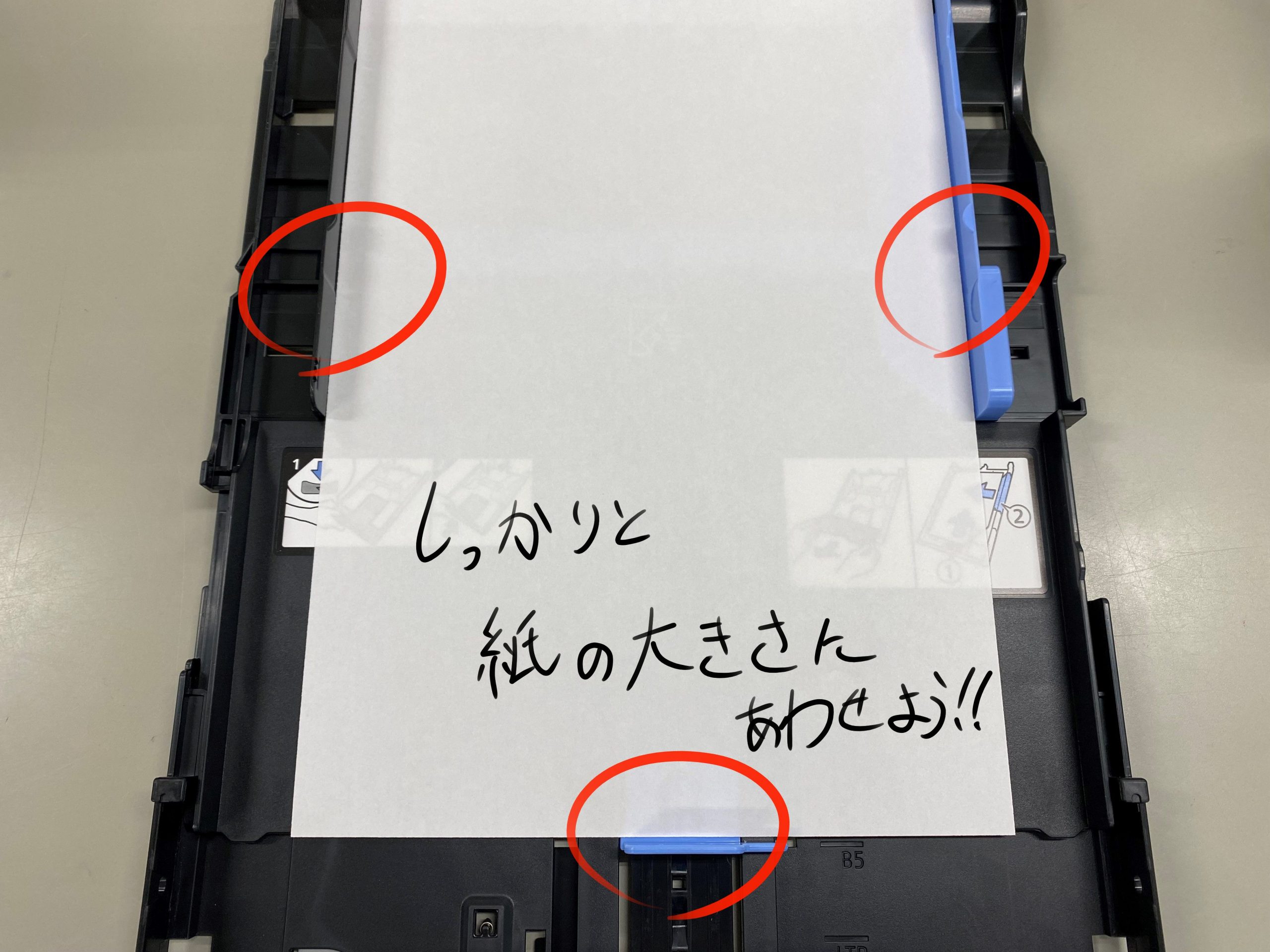 年賀状や写真など、普段と違うサイズの用紙に印刷するとき、用紙ガイドをしっかりとあわせるようにしましょう。これを合わせないと、例えば用紙が斜めにずれて給紙されてしまい、紙詰まりや給紙ユニットの故障につながることがあります。用紙の大きさを変えたら、用紙ガイドも調整してください。また、時々自分で切った紙で印刷をしている方がいますが、これも紙詰まりを起こしてしまうことがあるため、やめた方が良いように思います。