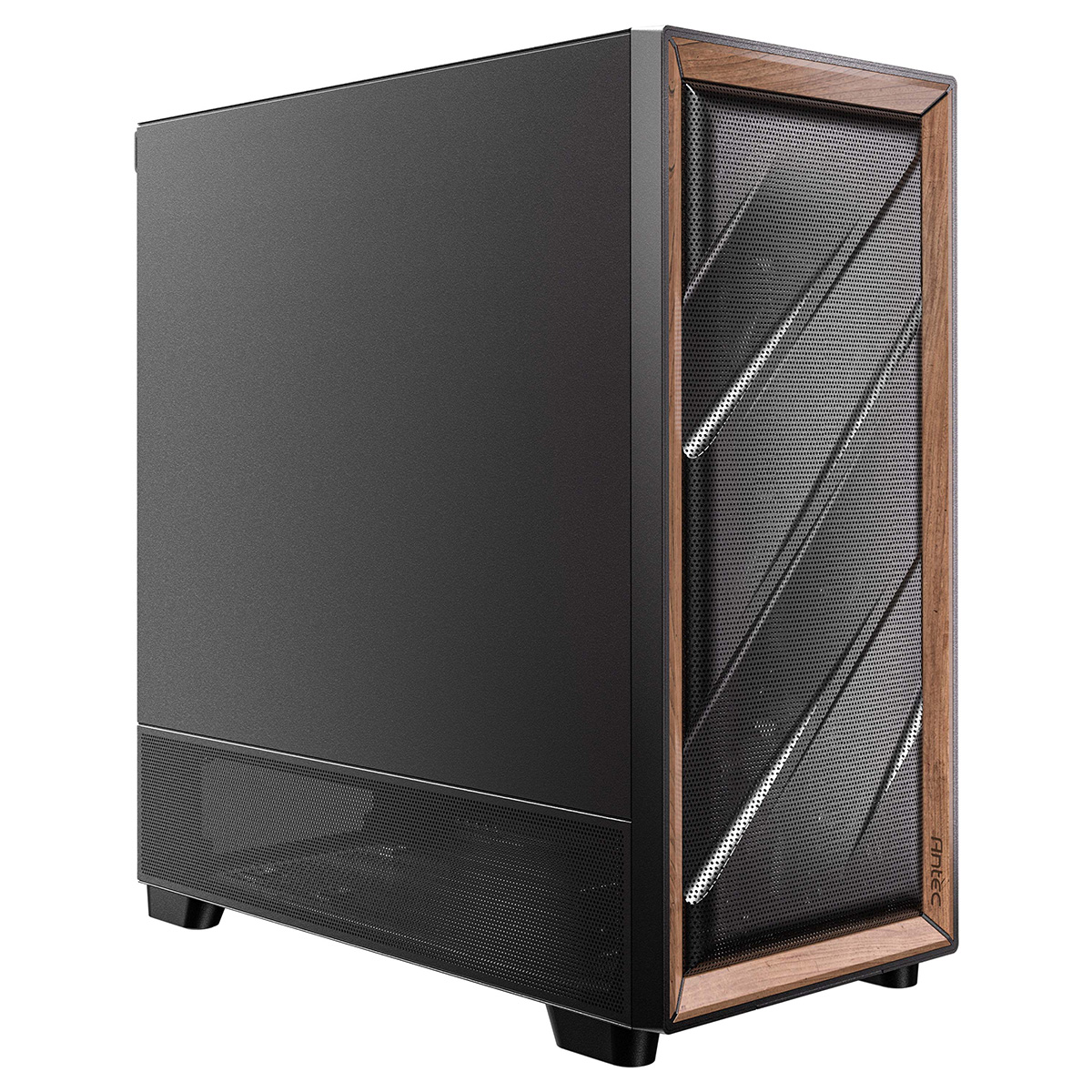基本PCケースの「Antec FLUX SE」は、吸音素材と本物の木材を使用した静音タイプのミドルタワーPCケースです。最大9基の120 mmファン搭載に対応し、5基のファンを標準搭載しています。メンテナンス性、清掃性を高めるダストフィルターを備えています。ケースフロントトップには、日常的に使う電源スイッチ、リセットスイッチ、USB 3.0×2、USB Type-C 10Gbps、Audio in/outを備えています。